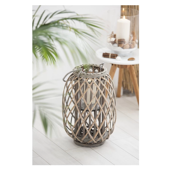 All diejenigen Trendsetter, die nicht genug von außergewöhnlicher Dekoration bekommen, werden das stilvolle Windlicht lieben! Dieses ist kunstvoll mit grauer Spaltweide ummantelt und vor allem dank dem extravaganten Design sowie dem aus Kordel bestehenden Henkel der absolute Hingucker, der ganz sicher nicht nur große Dekofans verzaubert. Durch das perfekte Zusammenspiel aus unterschiedlichen natürlichen Materialien sowie einer Größe von 17 x 41 cm integriert sich die Laterne nahtlos in jeden Raum ein und taucht ihn in Verbindung mit einem wohlig flackernden Teelicht (nicht im Lieferumfang enthalten) in eine paradiesische Wohlfühloase, die zum Entspannen und Träumen einlädt. Darüber hinaus ist sie auch ein wunderbares Stück für all diejenigen, die eine dezentere Dekoration bevorzugen, die Modernität jedoch nicht außer Acht lassen möchten.